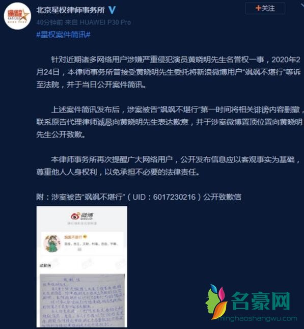 近日,网上曝出了一则关于黄晓明名誉权胜诉的消息,北京星权律师事务所发布案件简讯更新黄晓明名誉权案进度,并附上涉案被告的公开致歉信,表示:涉案被告“飒飒不堪行”第一时间将相关诽谤内容删撤。