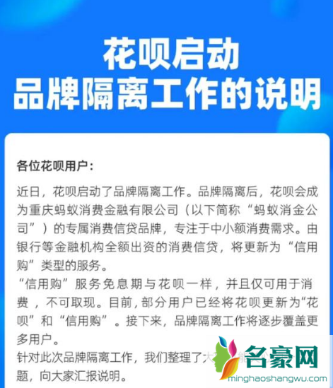 ,花呗产品目前已经开启品牌隔离,正逐渐在端内向用户推送。隔离后,由蚂蚁消费金融公司出资的叫做“花呗”,由银行等金融机构全额出资的服务叫做“信用购”。根据南都记者体验,升级改造后的产品对消费者使用影响不大,特别是可用额度基本不变,查账方式、还款方式、免息期、费率和服务机构都不会改变。