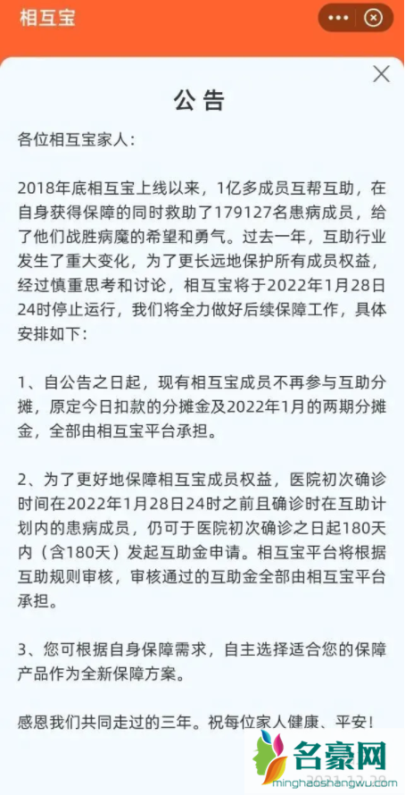 相互宝是支付宝在2018年推出的一项分摊互助的平台,对于一些有重大疾病但是无力承担医药费的人,可以通过相互宝来获得他人小金额的分摊互助。不过随着相互宝的分摊金额越来越高,退出的人越来越多,而且相关部门对支付宝金融业务的监管也有加紧。这次相互宝正式发布了停运公告,将于2022年1月28日停止。