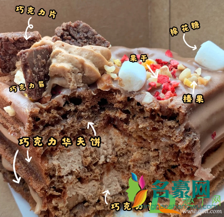 这款蛋糕是香蕉巧克力味的,最表面是一层脆脆的巧克力薄片,上面点缀着一点坚果呀棉花糖之类的。内馅是榛子酱和巧克力慕斯,整体华夫饼的口感比较松软。虽然是巧克力味,但这款蛋糕吃起来真的不腻喔!它并不是非常非常醇厚的巧克力蛋糕,而是略微带一点香蕉口味。(不过吃起来有一种好丽友派的感觉哈哈哈哈哈)