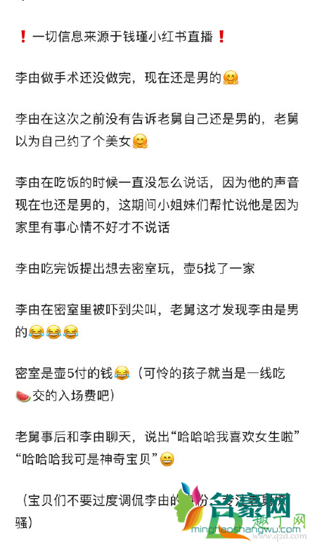 前几天任豪密室逃脱的瓜,昨天李由朋友直播说李由“只做了上半身没做下半身,还是个男人”,李由吃饭的时候一直没说话,在密室逃脱的时候被吓得尖叫,被任豪听出来是男声,后来就赶紧和李由划清界限。所以大家又开始嘲笑任豪又坏又蠢。