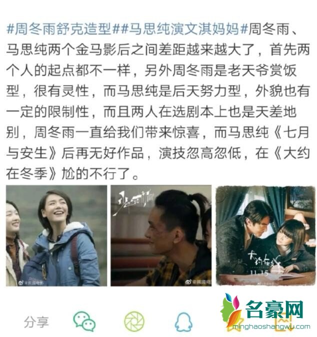 近日,有一网友看了马思纯最新的电影《大约在冬季》以后,这名网友就评价周冬雨的演技一直给大家带来惊喜,但是马思纯的演技却忽高忽低,吐槽尬得不行,随后马思纯本人也做出了回应。