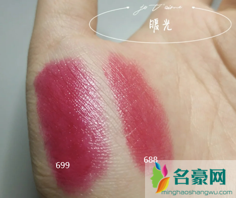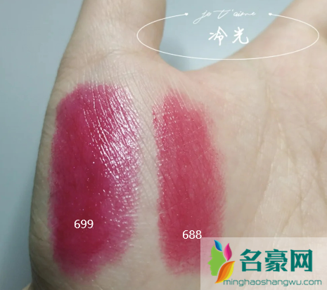 两款都是很滋润,不拔干的质地,会有轻微染唇。两种上嘴其实没有什么大的差别,仔细看的话,只能说688更发红,699更紫了。