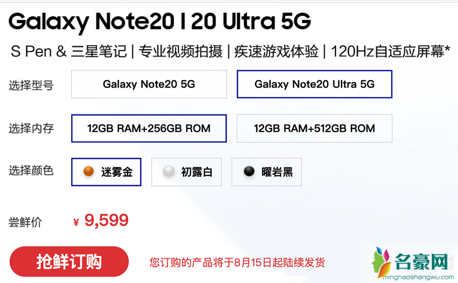 至于价格的话,GalaxyNote20Ultra 5G 提供了两个先行者版本可选:12+256GB 尝鲜价 9599 元 (迷雾金、初露白、曜岩黑)12+512GB 尝鲜价 10399 元(曜岩黑)