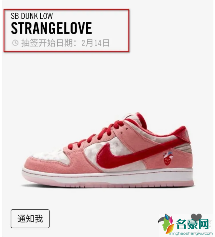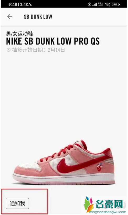 2.在框选位置可以看到该鞋于2月14日开始抽签。点击进去。