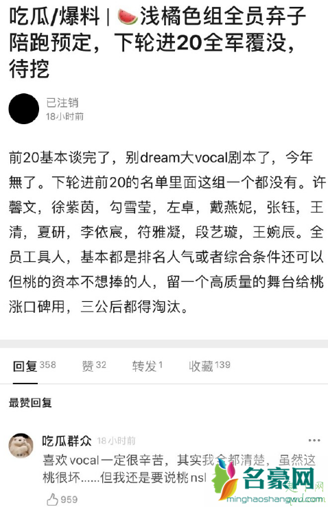 前20基本谈完了,别dream大voca剧本了,今年无了。下轮进前20的名单里面这组一个都没有。许馨文,徐紫茵,勾雪莹,左卓,戴燕妮,张钰,王清,夏研,李依宸,符雅凝,段艺璇,王婉辰。全员工具人,基本都是排名人气或者综合条件还可以 但桃的资本不想捧的人,留一个高质量的舞台给桃涨口碑用,三公后都得淘汰。
