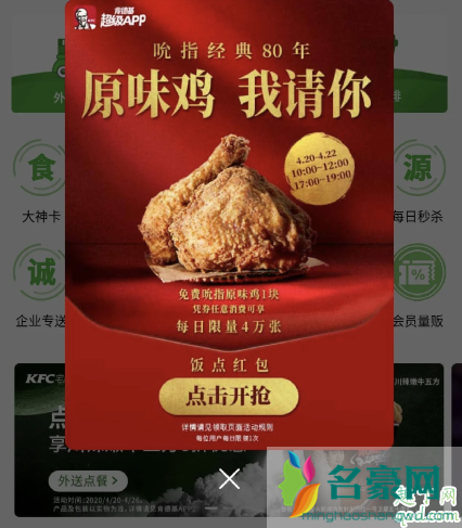 4月20- 22日 10:00-12:00、17:00-19:00免费吮指原味鸡(1块)凭券任意消费可享每天限量4万张券等你来抢