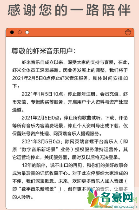 1月5日,虾米音乐发布官方声明表示,由于业务调整,虾米音乐2月5日关停。2021年3月5日0点后除网页端音乐人授权服务维持运营,其他运营均停止并关闭服务器,届时及以后将无法登录。目前,虾米已经启动歌单导出、会员退款及音乐人收益提现等服务。