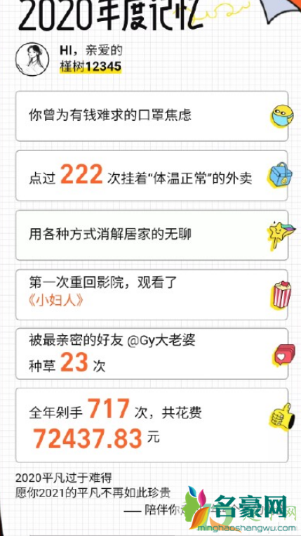 4、可查看到因疫情口罩被你搜索的次数,科比的意外离开24号球衣被搜索的次数你今年看了多少场电影?种草最多的店以及被你种草了多少次?当然不会少总共花费的费用,知道你全年剁手了多少次吗?