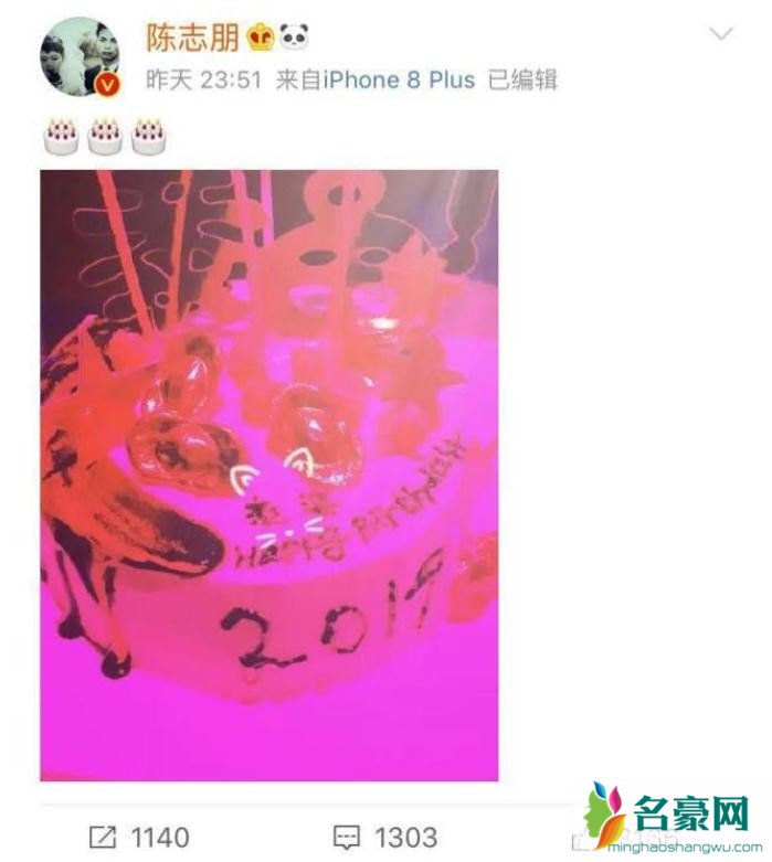 在4月22日晚上23.51分,陈志朋在微博上晒出了一张生日蛋糕照片,而且配上三个蛋糕的表情。有网友发现蛋糕上竟然写着“老婆,2019,HappyBirthday”的字样。