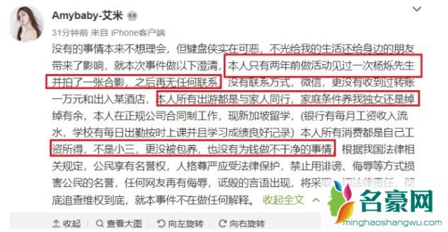 艾米在微博上称:自己和杨烁并没有关系,只是已经在一次活动中和杨烁见过一次面,而且自己是家中的独生女,并不缺钱花。并且艾米还表示自己现在还是一名学生,并不存在转账一万和出入酒店的事情。