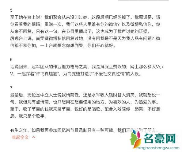 本以为此事就此了结了,没想到许飞却突然站出来发声,台上没有吵够的架,台下又开始继续撕了起来,许飞发表了长文直接开撕尚雯婕:指责尚雯婕拿到冠军之后,就和自己没有私下交集了,有过几次工作交集许飞向尚雯婕索要微信都被她拒绝了,暗指她红了之后耍大牌不联系,明明就和大家不熟,还在台上和大家装亲热,想念到哭。