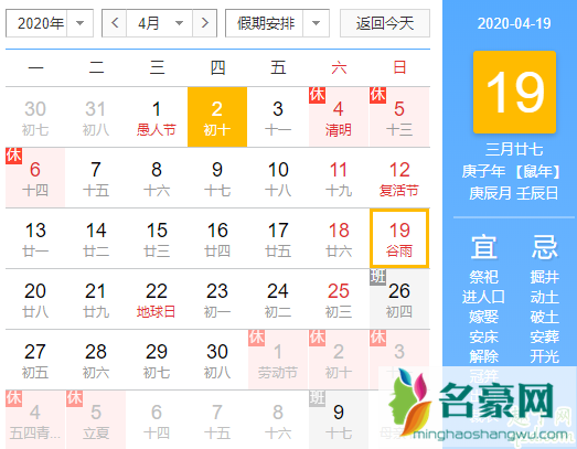 2020年谷雨时间:4月19日 22:45:21,农历 2020年三月(大)廿七