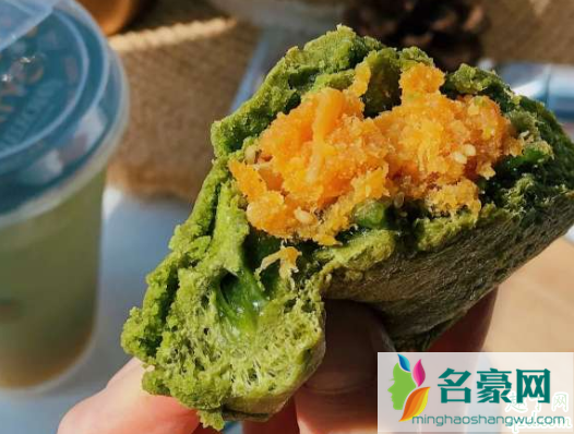咸蛋蟹黄肉松,青团麻薯,口感就是青团外面包了层面包皮个头小!