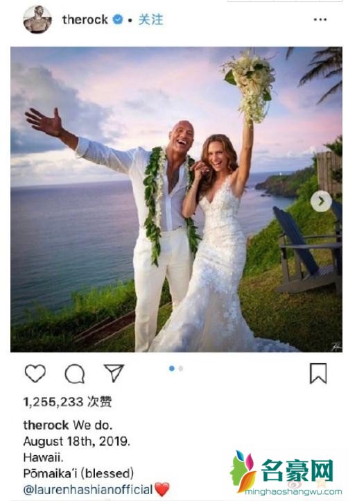 8月18日,巨石强森在社交平台上晒出了一张与娇妻的婚纱照,并且宣告与妻子结婚了。照片中的巨石强森身材白色西装,而一旁的妻子则是身穿典雅纯白长婚纱,尽显火辣身材。