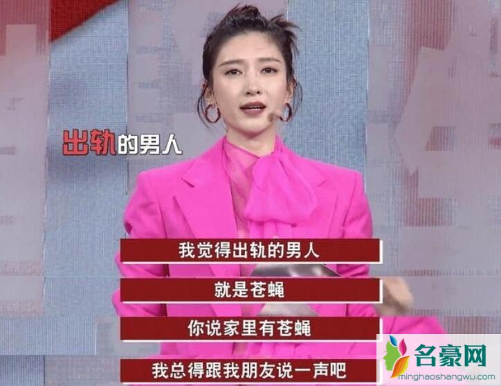 随后,江疏影谈起了爱情观,江疏影认为爱情是一场警匪片,永远不要指望男人会对你缴械投降自动自首,闺蜜永远是站在闺蜜这一边的。江疏影霸气将出轨的男人比作苍蝇,而对于闺蜜另一半出轨到底要不要说,她是这么打比方的,认为家里有苍蝇那是一定要跟朋友说一声的。