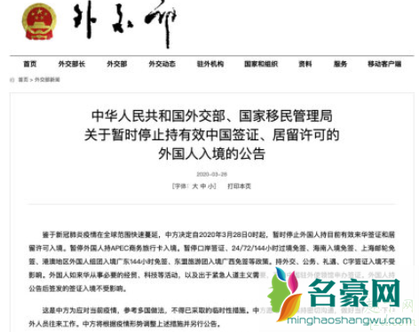 中方决定自2020年3月28日0时起,暂时停止外国人持目前有效来华签证和居留许可入境。暂停外国人持APEC商务旅行卡入境。暂停口岸签证、24/72/144小时过境免签、海南入境免签、上海邮轮免签、港澳地区外国人组团入境广东144小时免签、东盟旅游团入境广西免签等政策。持外交、公务、礼遇、C字签证入境不受影响。外国人如来华从事必要的经贸、科技等活动,以及出于紧急人道主义需要,可向中国驻外使领馆申办签证。外国人持公告后签发的签证入境不受影响。