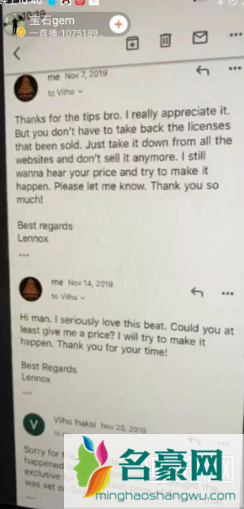 5、董宝石表示自己积极联系编曲作者,并放了截图。时间为2019年11月2日,董宝石方原话意思应该是,喜欢伴奏,想要买下它的独家版权,请问作者觉得价格多少合适。原作者也于次日,也就是2019年11月3日回复了他。大概是意思是很开心伴奏得到认可,但是对于独家出售不感兴趣,他非常推荐用无限制的租用代替独家购买。2019年11月7日,董宝石方回复,意思是早就买了无限制租用,但还是希望可以买下独家,请他给个价。