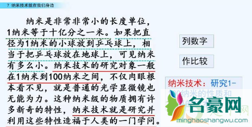 总结起来:在这一段话中,为了介绍清楚“纳米”和“纳米技术”,作者用了总分的结构,具体介绍的过程中又运用了“列数字”和“作比较”的方法,你学会了吗?
