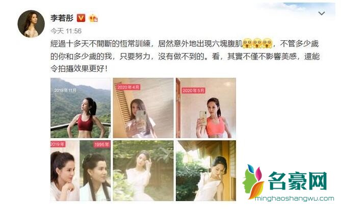 李若彤晒照秀腹肌,配文:经过十多天的恒常训练,居然练出6块腹肌。